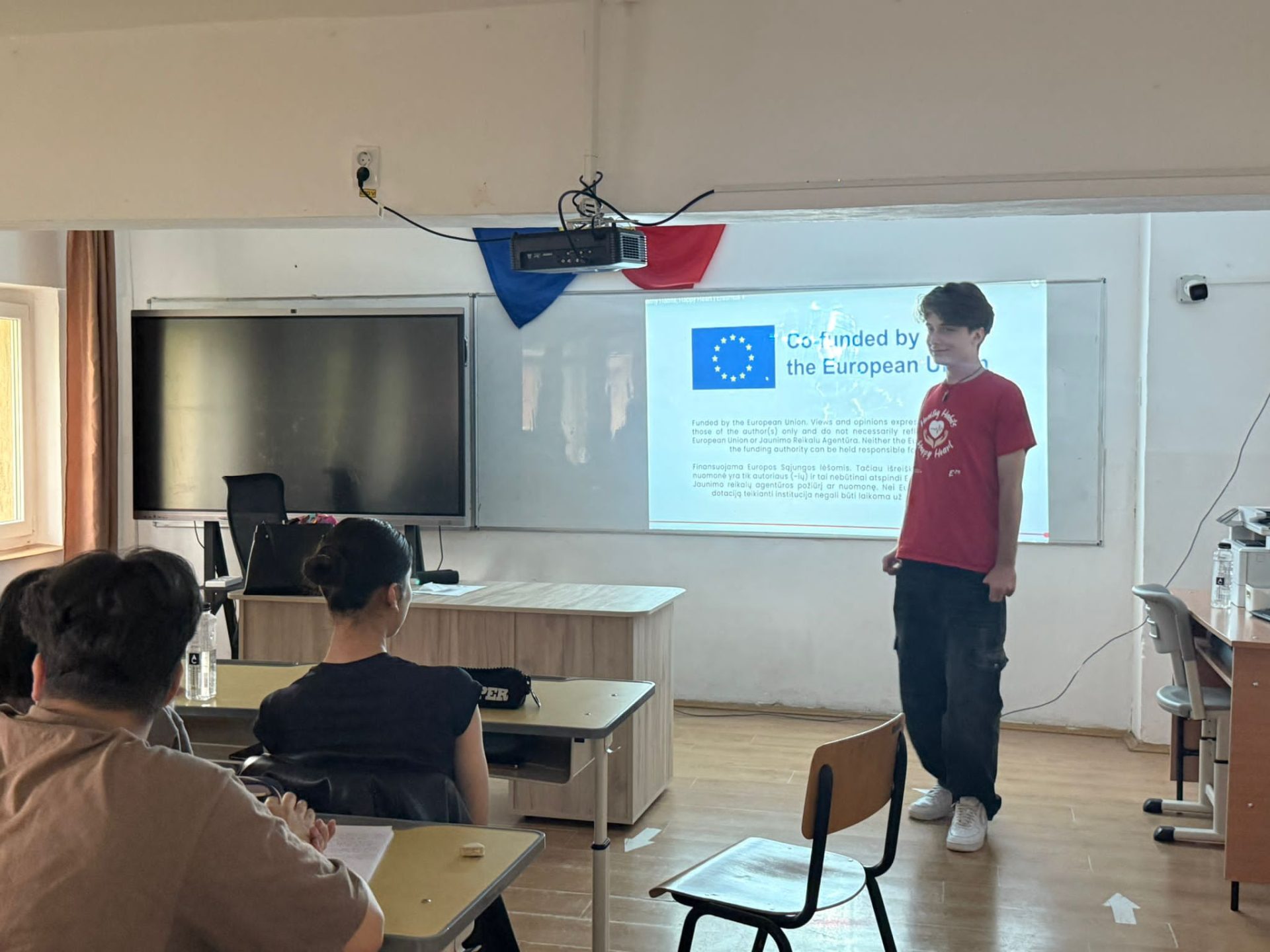 Dissemination by Andrei and Alexandru at Liceul Teoretic Octavian C. Tăslăuanu for 30 classmates, presenting Erasmus+, E29 network, how to join, and highlights from his own experience.